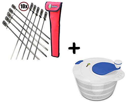 Cave Tools BBQ Skewers (10) Extra Long + Salad Spinner Large 4.2 Quarts Serving Bowl Set - QUICK DRY DESIGN & DISHWASHER SAFE - BPA Free Plastic - No Pump Pull String Needed, Turn Knob Drys Vegetables Fast