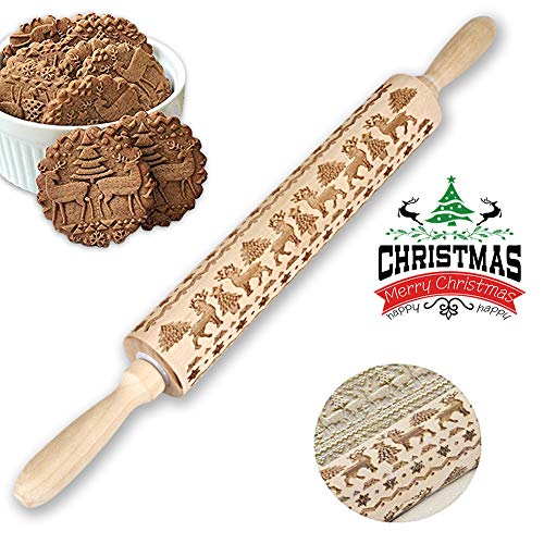 Aodis Christmas Wooden Rolling Pins, Engraved Embossing Rolling Pin with Christmas Tree Deer Pattern For baking Christmas Theme Pastries & Cookies