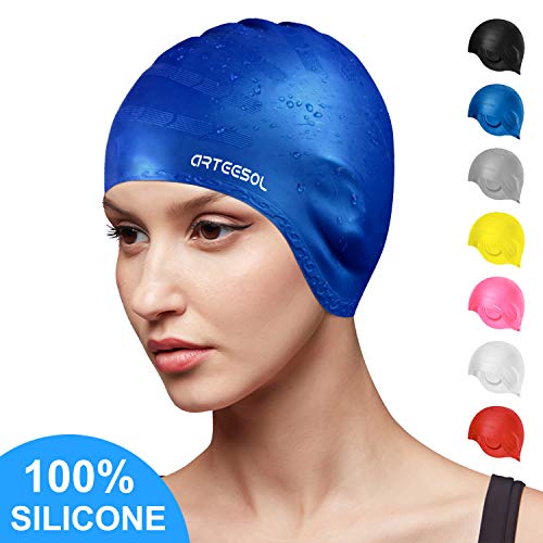 • arteesol Swimming Cap, Silicone Swim Cap for Women Men, Durable Non-Slip Waterproof Swim Cap Protect Ears, Long Hair for Adults, Older Kids, Boys and Girls (Blue, 1pcs)