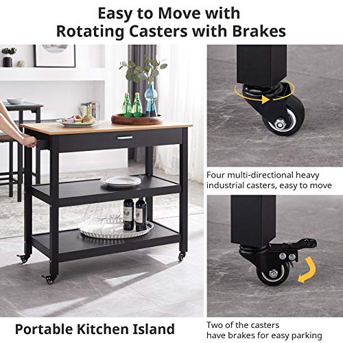 Smile Back Kitchen Island with Wheel, 40’’ x 20’’ Kitchen Islands 3 Tier Rolling Kitchen Cart with Storage Kitchen Islands Cart with1 Drawer and 2 Spacious Storage Shelf Solid Wood Top (Black+Walnut), 40'' x 20'' x 37''