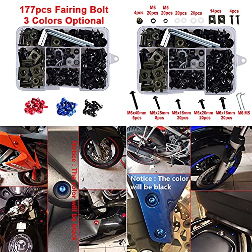 • Motorcycle Fairing Bolt Kit, 177pcs M5 M6 Motorcycle Windscreen Screws Colorful Fasteners Fairing Bolts Nut Clips Kit for Kawasak Suzuki Honda Ducati Yamaha BMW GSXR Motorcycle (Black)