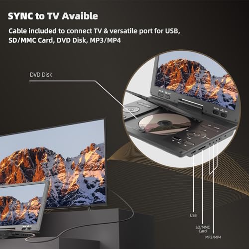 • 14.9" Portable DVD Player with 12.5" Large HD Swivel Screen, 6 Hours Rechargeable Battery, Exclusive Button Design, Car Headrest Mount Provided, High Volume Speaker, Support CD/DVD/SD Card/USB