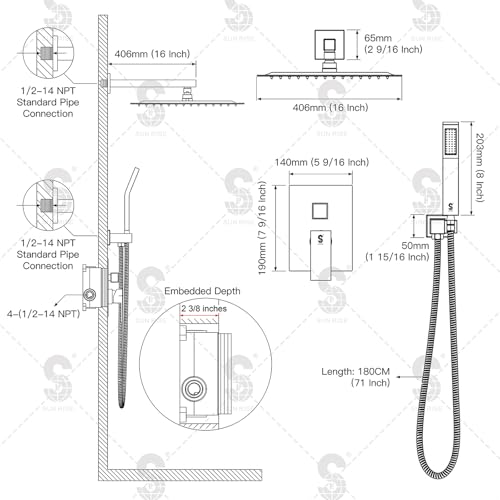 • SR SUN RISE Matte Black Square Rainfall Shower Head and Handle Set, Wall Mounted Shower Fixtures, Metal Shower Faucet Trim Repair Kits (With Shower Valve) 16 Inches