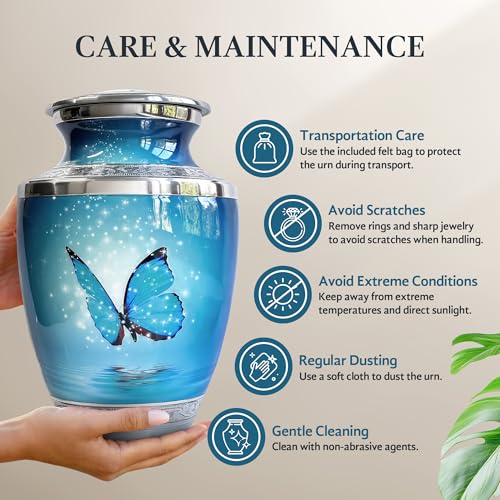 • Malaika Memorials Blue Butterfly Urn for Ashes for Women/Men, Cremation Urns for Human Ashes Adult Female/Male, 200 Cubic Inch Capacity