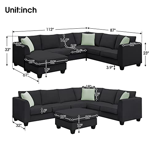 Merax Modern Large U-Shape Sectional Sofa, 7 Seat Fabric Sectional Sofa Set with Movable Ottoman, L Shape Sectional Sofa Corner Couch with 3 Pillows for Living Room Apartment,Office, Black, 112"