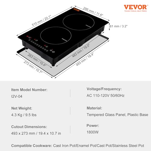 • VEVOR Electric Cooktop, 2 Burners, 12'' Induction Stove Top, Built-in Magnetic Cooktop 1800W, 9 Heating Level Multifunctional Burner, LED Touch Screen w/Child Lock & Over-Temperature Protection