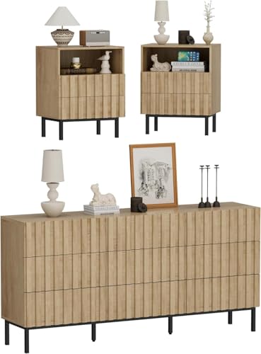• UEV 3 Piece Dresser and Nightstand Sets for Bedroom, 59" Long 9 Drawer Dresser & Nightstand Set of 2, Modern Fluted Solid Wood Dressers Set, Bedroom Furniture Set(Ivory White