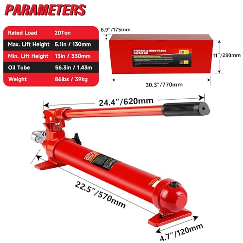 • 20 Ton Mini Hydraulic Cylinder Jack, 5.1" Stroke Hydraulic Porta Power Ram, Low Profile Steel Jack Kit with Oil Hose, Single-Acting Hydraulic Hand Pump for Lifting Machinery and Shipbuilding, Red