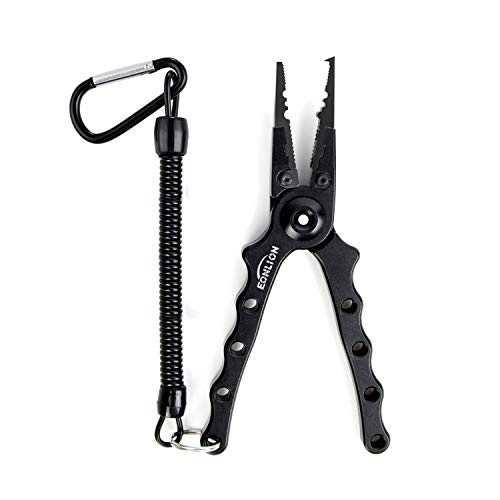 EONLION Fishing Pliers, Aluminum Fishing Hand Hook Remover, Braid Line Cutters, Crimper, Split Ring Tool with Sheath and Lanyard, Black