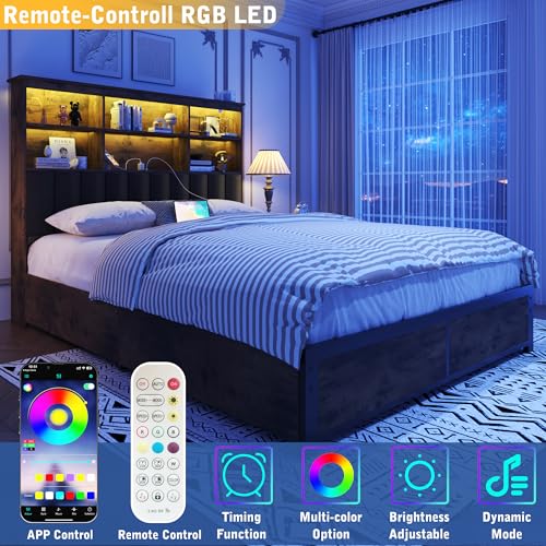 Lifezone Queen Bed Frame with Headboard, Queen Bed Frame with High Storage Bookcase Headboard,4 Storage Drawers & Charging Station & LED,No Box Spring Needed/Noise Free/All-Metal Support,Vintage Brown